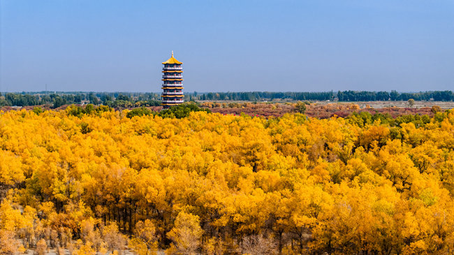 Photo shows the Jinta desert populus euphratica forest scenic spot in Jinta county, Jiuquan city, northwest China's Gansu Province. (Photo courtesy the media convergence center of China Railway Lanzhou Bureau Group Co., Ltd.)