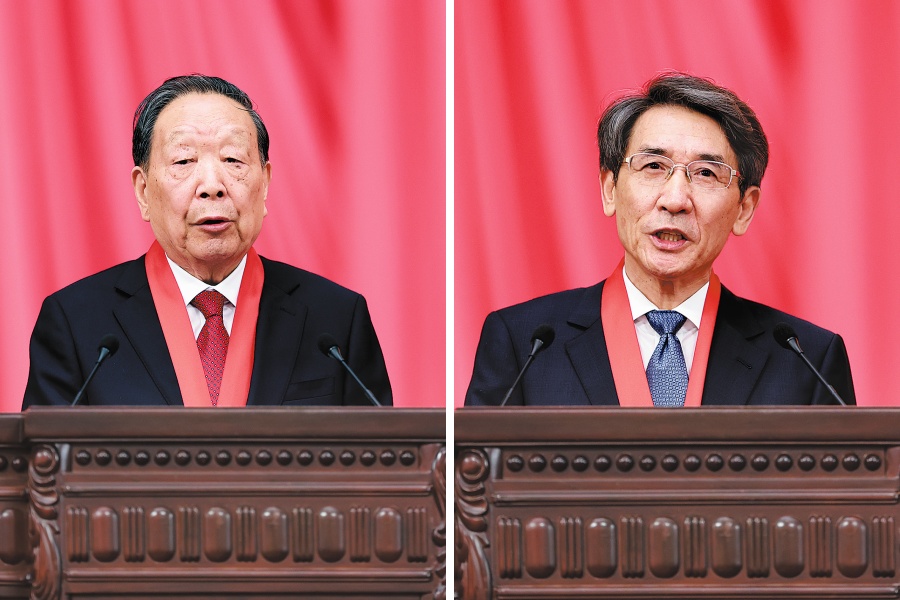 Li Deren (left), an academician of the Chinese Academy of Sciences and the Chinese Academy of Engineering from Wuhan University, and Xue Qikun, an academician of the CAS from Tsinghua University, received China’s top sci-tech award in Beijing on Monday. (FENG YONGBIN/CHINA DAILY)