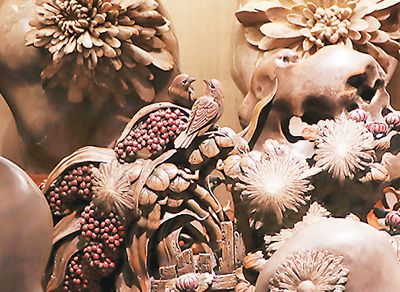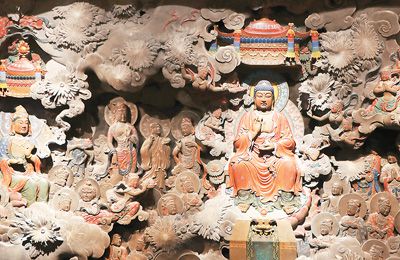 Photo shows a section of Chen Jiwu's chrysanthemum stone carving artwork inspired by Buddhism. (People's Daily Overseas Edition/Kang Pu)