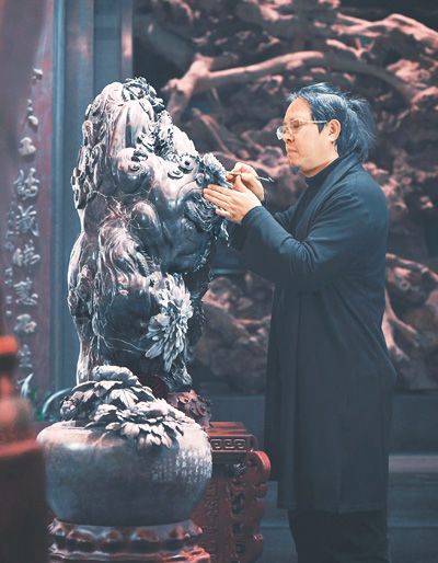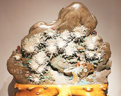 Photo shows a piece of chrysanthemum stone carving artwork by Chen Jiwu. (People's Daily Overseas Edition/Kang Pu)