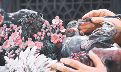 An artisan polishes a piece of chrysanthemum stone carving artwork. (People's Daily Overseas Edition/Kang Pu)