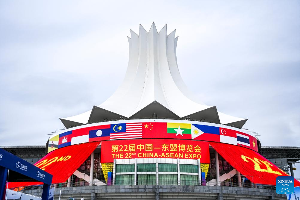 This photo taken on Sept. 17, 2025 shows a view of Nanning International Convention and Exhibition Center in Nanning, capital of south China's Guangxi Zhuang Autonomous Region. The 22nd China-ASEAN Expo and the China-ASEAN Business and Investment Summit kicked off here on Wednesday. (Xinhua/Cao Yiming)
