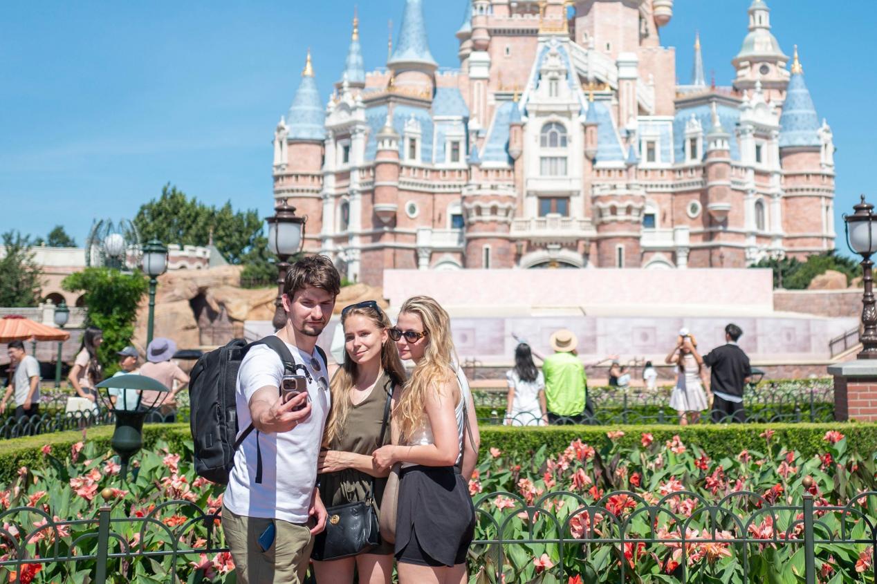 Foreign tourists pose for a picture at Shanghai Disney Resort, in Shanghai, east China, Aug. 28, 2025. (Photo/Wang Chu)