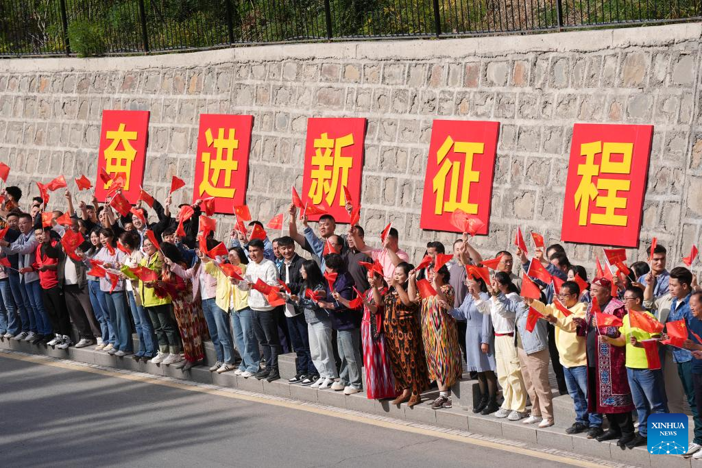Chinese President Xi Jinping, also general secretary of the Communist Party of China Central Committee and chairman of the Central Military Commission, and the delegation receive a warm welcome from people of various ethnic groups at the Urumqi Tianshan International Airport and in Urumqi's city proper, northwest China's Xinjiang Uygur Autonomous Region, Sept. 23, 2025. Xi, who leads a central delegation, arrived in Urumqi, capital of Xinjiang Uygur Autonomous Region, on Tuesday to attend activities marking the region's 70th founding anniversary. (Xinhua/Yao Dawei)