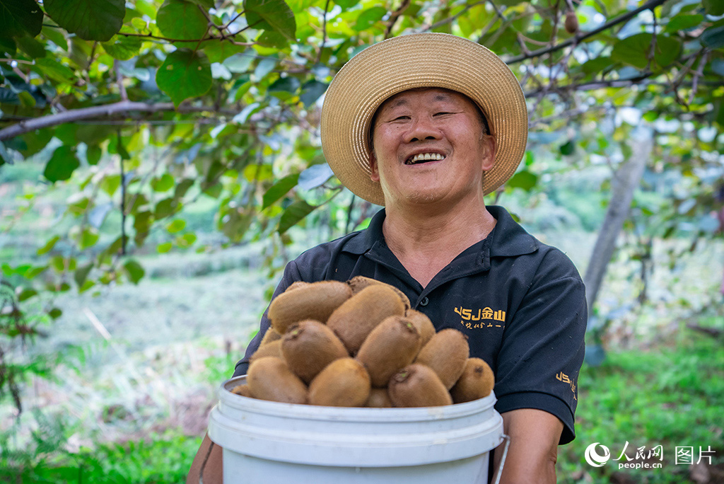 A farmer displays kiwifruit at an orchard in Pingtan village, Gubao town, Xiuwen county, Guiyang, southwest China's Guizhou Province, on Sept. 21, 2025. (People's Daily Online/Tu Min)
