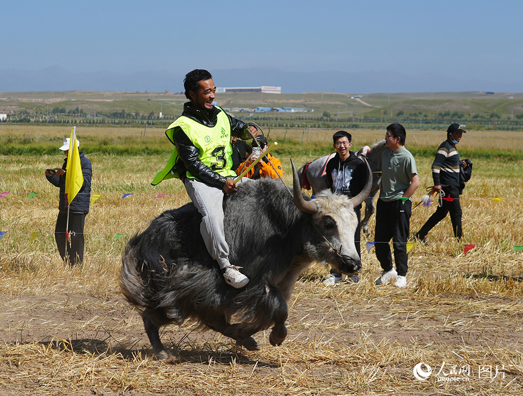Herders participate in a yak race in Haibei Tibetan Autonomous Prefecture, northwest China's Qinghai Province, on Sept. 19, 2025. (People's Daily Online/Yang Qihong)