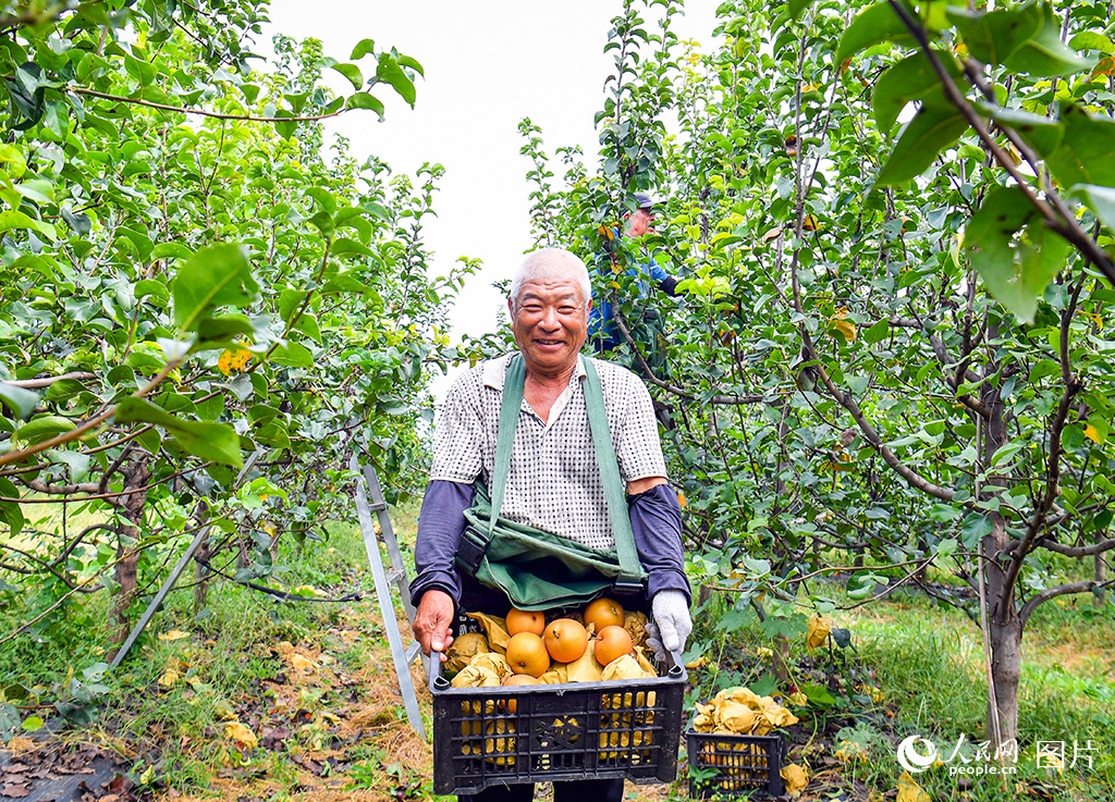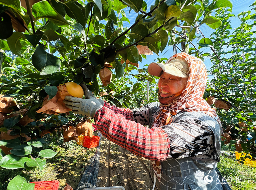 A farmer picks pears at an orchard in Anlezhuang village, Muyudian town, Laiyang city, east China's Shandong Province, on Sept. 18, 2025. (People's Daily Online/Qiao Shu)