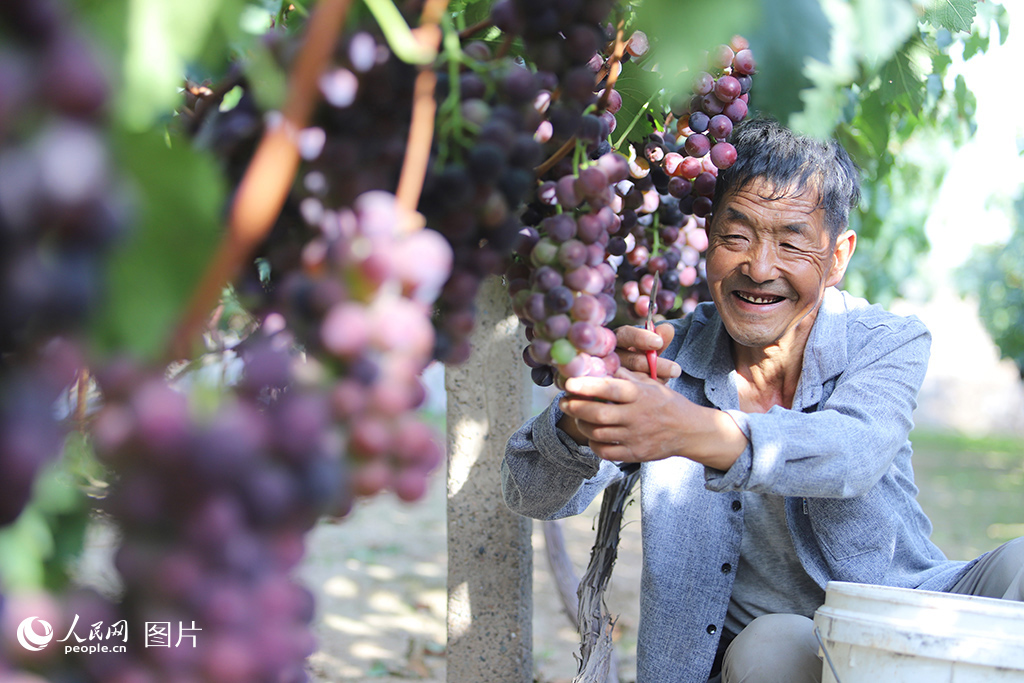 A farmer prepares for the grape harvest at an orchard in Qingshiwan village, Lanzhou, northwest China's Gansu Province, on Sept. 18, 2025. (People's Daily Online/Mi Yuan)