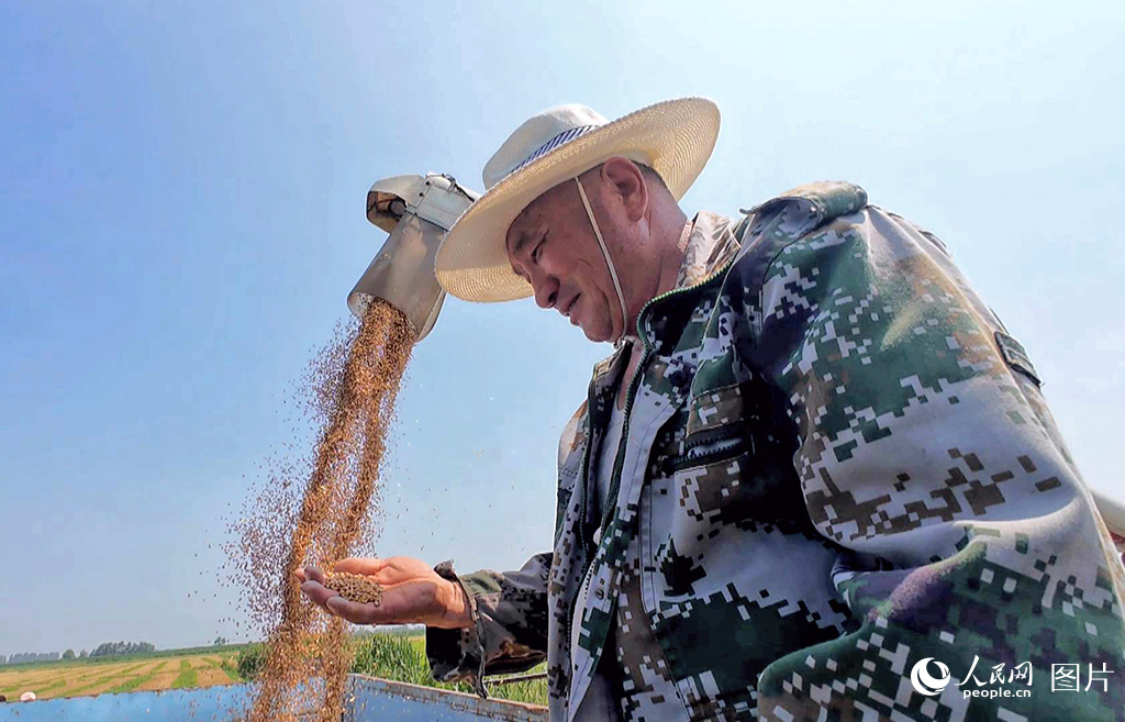 A farmer examines freshly harvested wheat in Lanfeng village, Helan county, Yinchuan city, northwest China's Ningxia Hui Autonomous Region, on Sept. 17, 2025. (People's Daily Online/Yan Mengjie)