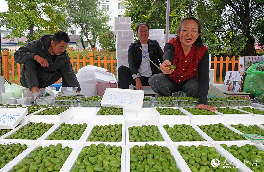 Li Xiufang and fellow villagers sell hardy kiwi at a market in Liangshui Korean Township, Ji'an city, a county-level city administered by Tonghua city, northeast China's Jilin Province, on Sept. 17, 2025. (People's Daily Online/Li Yang)