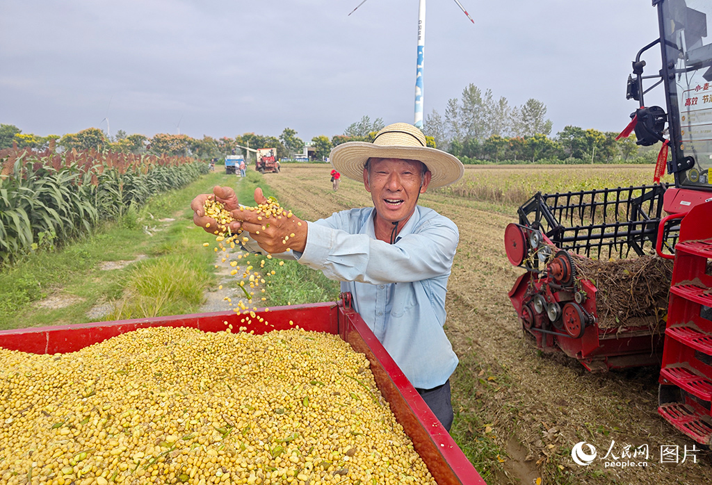 A villager displays freshly harvested soybeans in Jiangchang village, Jiangchang town, Tianmen city, central China's Hubei Province, on Sept. 17, 2025. (People's Daily Online/Zhang Jun)
