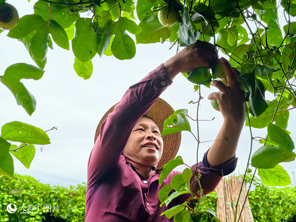 A villager picks passion fruits at an orchard in Dongshan town, Haikou, south China's Hainan Province, on Sept. 17, 2025. (People's Daily Online/Fu Zemin)