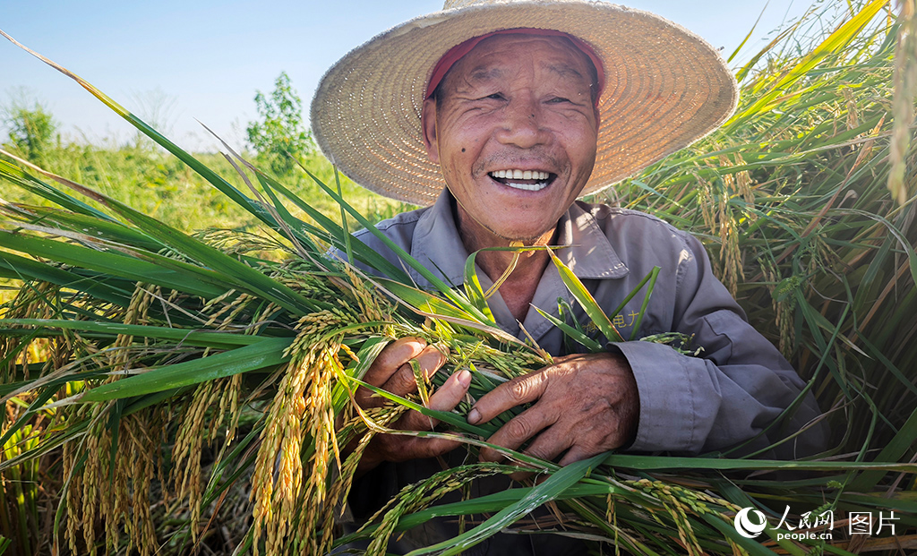 A farmer showcases freshly harvested rice in Liangxianjie village, Jingzhou city, central China's Hubei Province, on Sept. 16, 2025. (People's Daily Online/Wang Guoji)