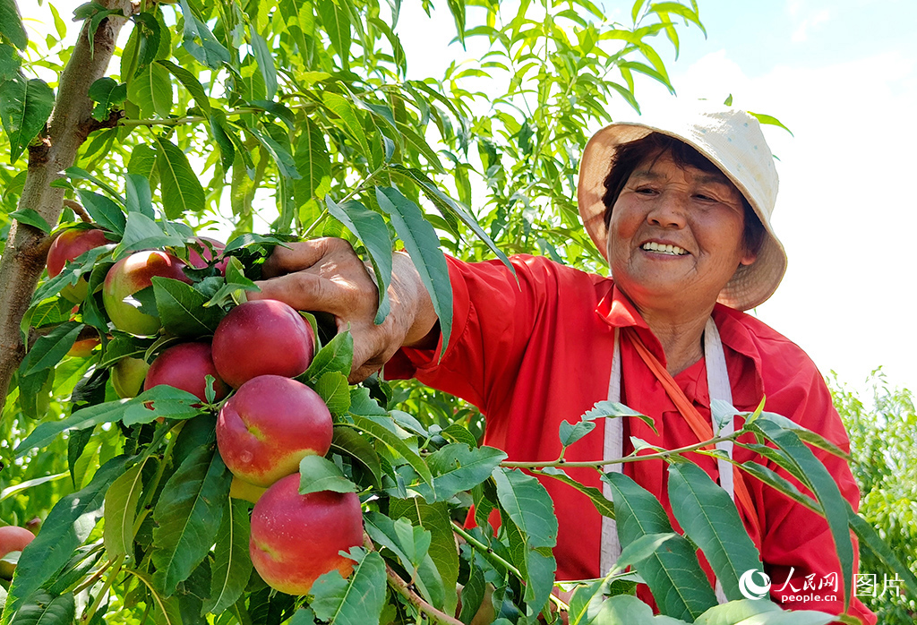 A farmer picks ripe nectarines in Fengjiayuan village, Guxian town, Lingbao city, central China's Henan Province, on Sept. 13, 2025. (People's Daily Online/Wang Yuxing)