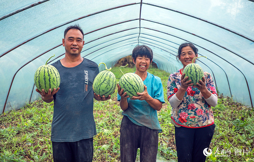 Villagers showcase freshly picked watermelons in Hufeng town, Tongliang district, southwest China's Chongqing Municipality, in July 2025. (People's Daily Online/Zhou Zhenyu)
