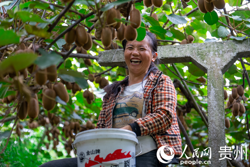 A villager smiles at a kiwi fruit orchard in Pingtan village, Gubao town, Xiuwen county, Guiyang, southwest China's Guizhou Province. (People's Daily Online/Tu Min)