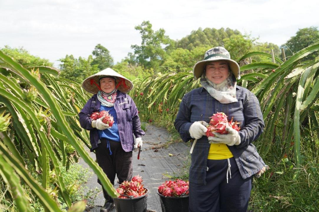 At the China–Laos crop excellent varieties experimental station in Vientiane, Laos, local farmers pose for a picture during a pitaya harvest. (Photo/Sorsonphan Somphone)
