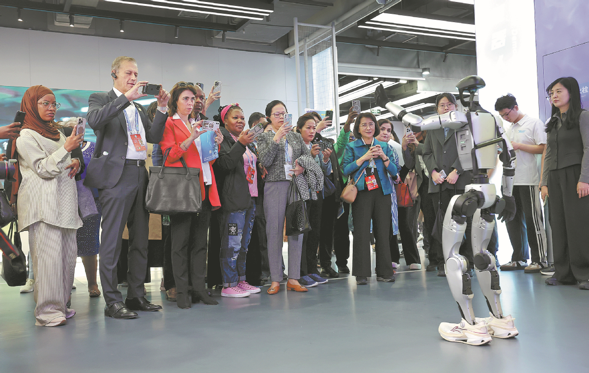 Foreign delegates attending the Global Leaders' Meeting on Women, which was held in Beijing on Monday and Tuesday, take photos of a humanoid robot on Tuesday during their visit to the Robot World — a comprehensive robot exhibition center in the Beijing Economic-Technological Development Area, also known as Beijing E-Town. The delegates also visited a women and children's service center in Beijing's Shunyi district. ZOU HONG/CHINA DAILY