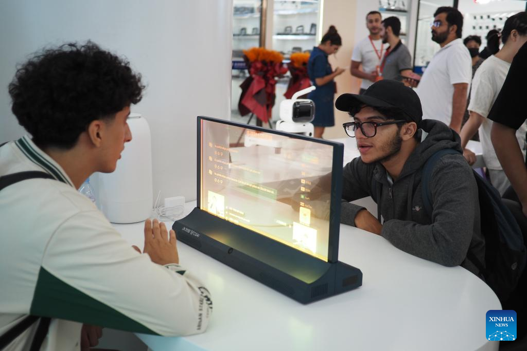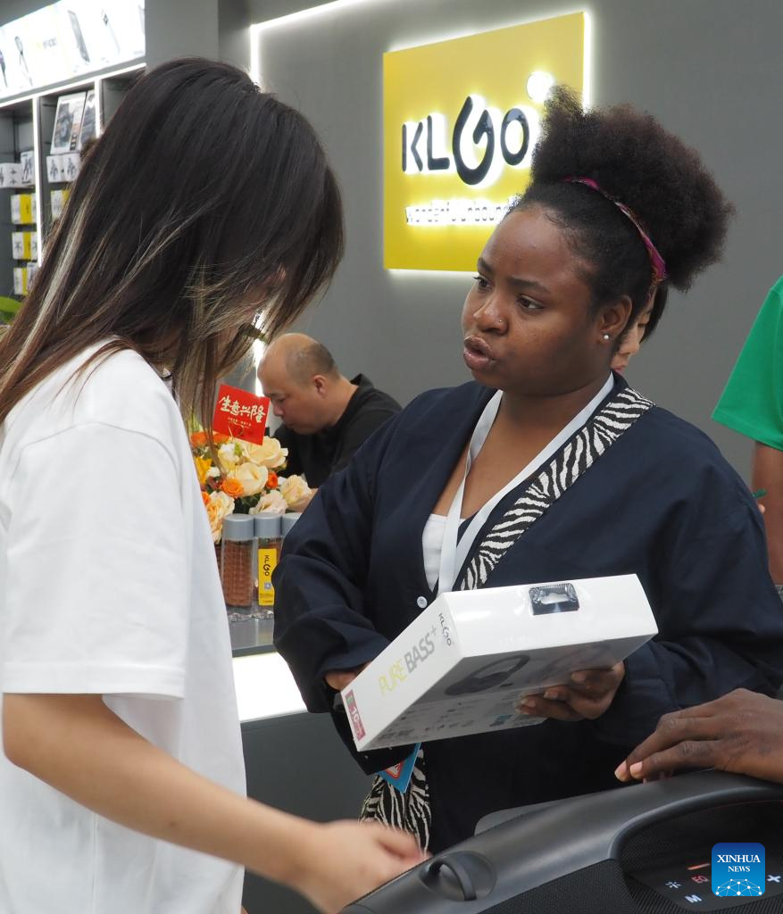 A foreign merchant purchases digital products at a store at the Global Digital Trade Center in Yiwu, east China's Zhejiang Province, Oct. 14, 2025. The Global Digital Trade Center, a landmark project in the construction of the sixth generation market in Yiwu, opened here on Tuesday, marking that Yiwu has started a new process of leaping from traditional trade mode to digital trade mode.