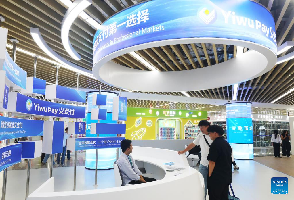 Merchants learn about the "Yiwu Pay" platform at the Global Digital Trade Center in Yiwu, east China's Zhejiang Province, Oct. 14, 2025. The Global Digital Trade Center, a landmark project in the construction of the sixth generation market in Yiwu, opened here on Tuesday, marking that Yiwu has started a new process of leaping from traditional trade mode to digital trade mode.