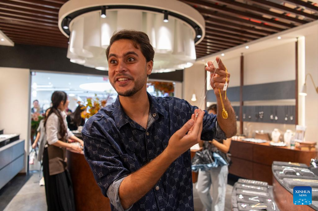 A foreign merchant purchases jewelry and accessories at the Global Digital Trade Center in Yiwu, east China's Zhejiang Province, Oct. 14, 2025. The Global Digital Trade Center, a landmark project in the construction of the sixth generation market in Yiwu, opened here on Tuesday, marking that Yiwu has started a new process of leaping from traditional trade mode to digital trade mode.