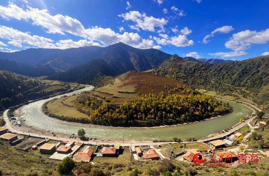 In October, in Padma county of the Golog Tibetan Autonomous Prefecture, northwest China's Qinghai Province, the autumn wind has already painted Padma in its richest colors. At an average elevation of 3,600 meters, the county's Markog River forest hides the most dazzling autumn on the Qinghai-Xizang Plateau. From high above, this pristine forest, located at the border of Qinghai and southwest China's Sichuan Province, looks like a gem set into the earth, radiating enchanting light.