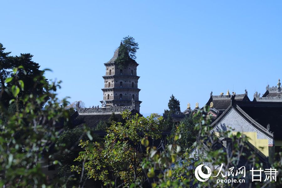 Photo shows an autumn view of Lingkong Tower, with a pine tree growing on top, in the Kongtong Mountain scenic area in Pingliang city, northwest China's Gansu Province. (People's Daily Online/Mi Yuan)