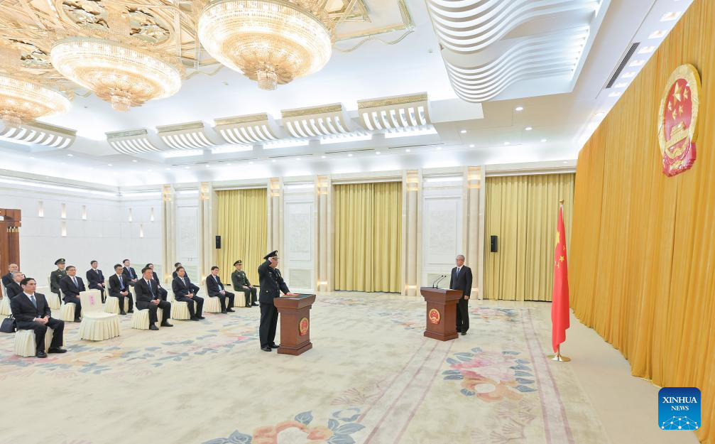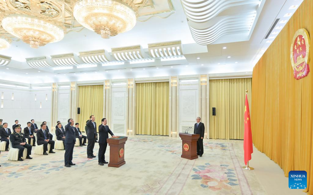 Li Hongzhong, vice chairman of the National People's Congress (NPC) Standing Committee, chairs and oversees an oath-taking ceremony held by the 14th NPC Standing Committee to pledge allegiance to the Constitution at the Great Hall of the People in Beijing, capital of China, Oct. 28, 2025. (Xinhua/Gao Jie)