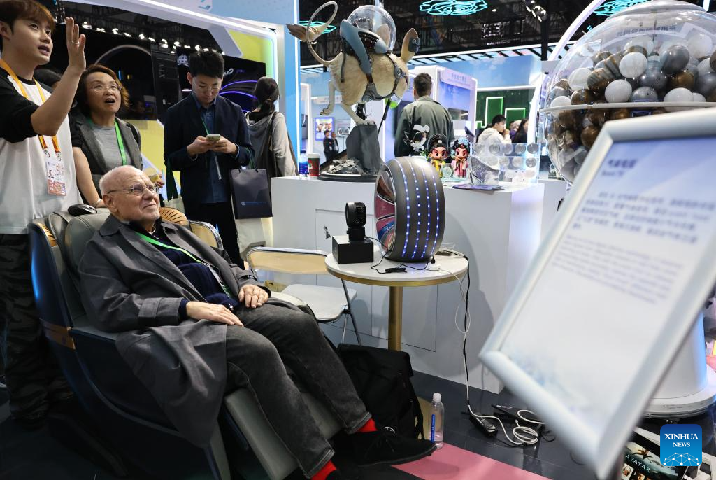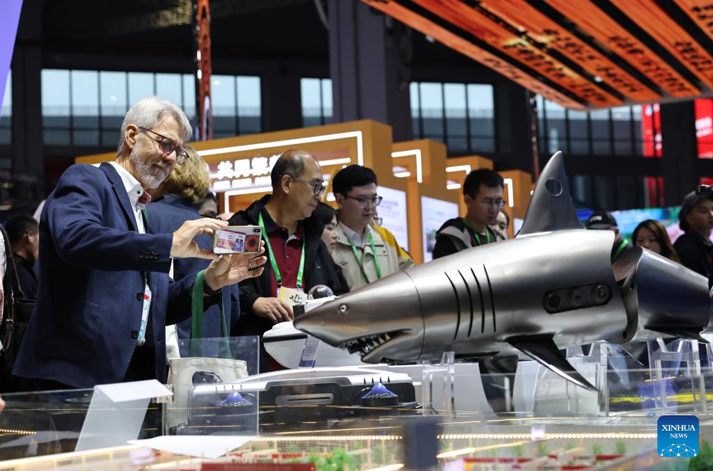 A guest takes photos of a bionic shark exhibited at the China Pavilion during the eighth China International Import Expo (CIIE) in east China's Shanghai, Nov. 8, 2025. Over 30 foreign talents and their families were invited to visit the eighth CIIE at the National Convention and Exhibition Center (Shanghai) during a themed event on Saturday. (Xinhua/Fang Zhe)