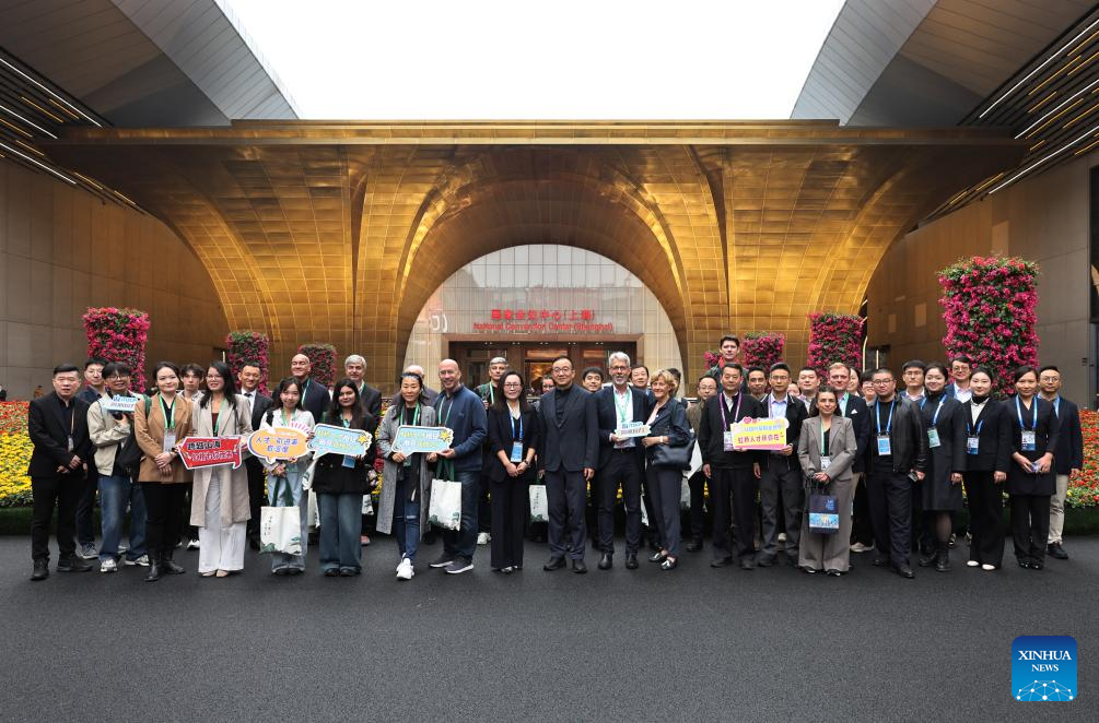 Guests pose for a group photo in front of the gate of the National Convention Center (Shanghai) during the eighth China International Import Expo (CIIE) in east China's Shanghai, Nov. 8, 2025. Over 30 foreign talents and their families were invited to visit the eighth CIIE at the National Convention and Exhibition Center (Shanghai) during a themed event on Saturday. (Xinhua/Fang Zhe)