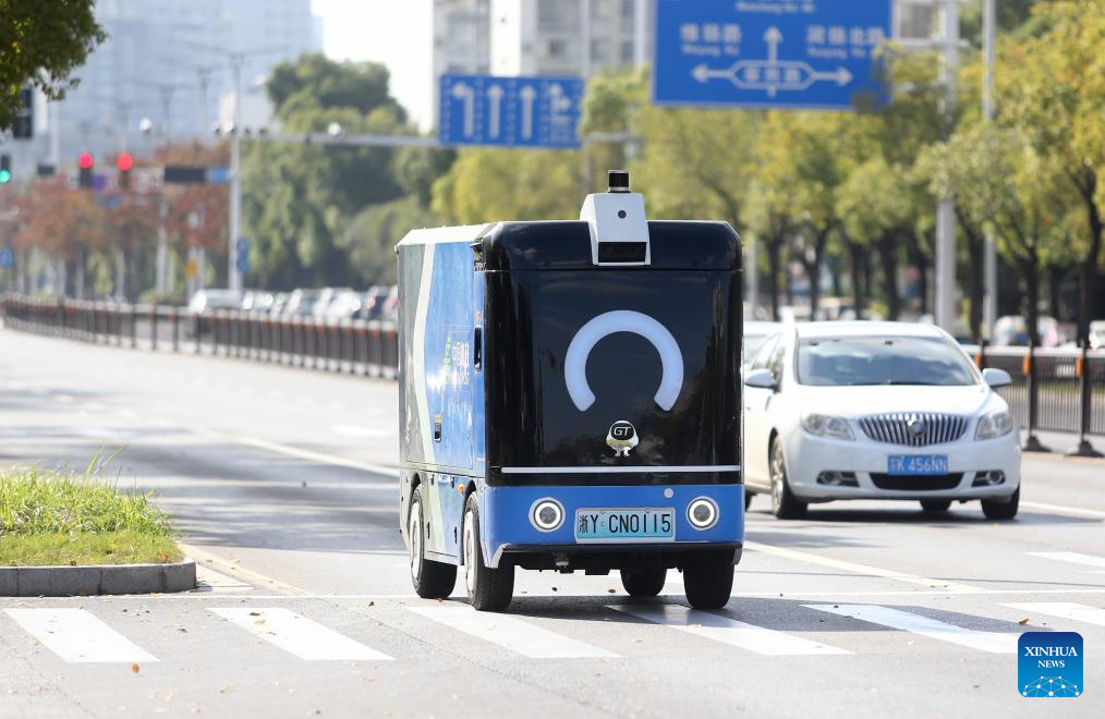 A self-driving delivery vehicle transports packages in Yangzhou City, east China's Jiangsu Province, Nov. 11, 2025. E-commerce and logistics companies across China are working at full capacity during the annual "Double Eleven" shopping festival. (Photo by Meng Delong/Xinhua)