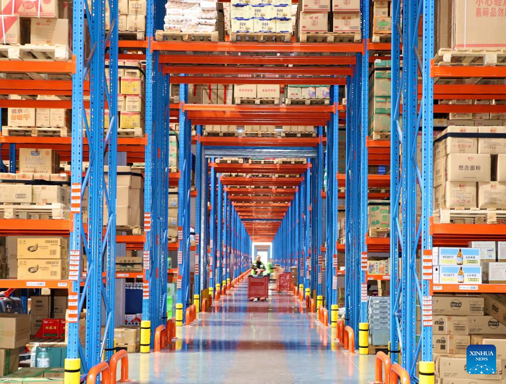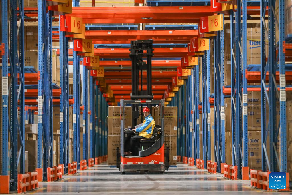 A staff member transports goods at a logistics park in Nanyang City, central China's Henan Province, Nov. 11, 2025. E-commerce and logistics companies across China are working at full capacity during the annual "Double Eleven" shopping festival. (Photo by Gao Song/Xinhua)