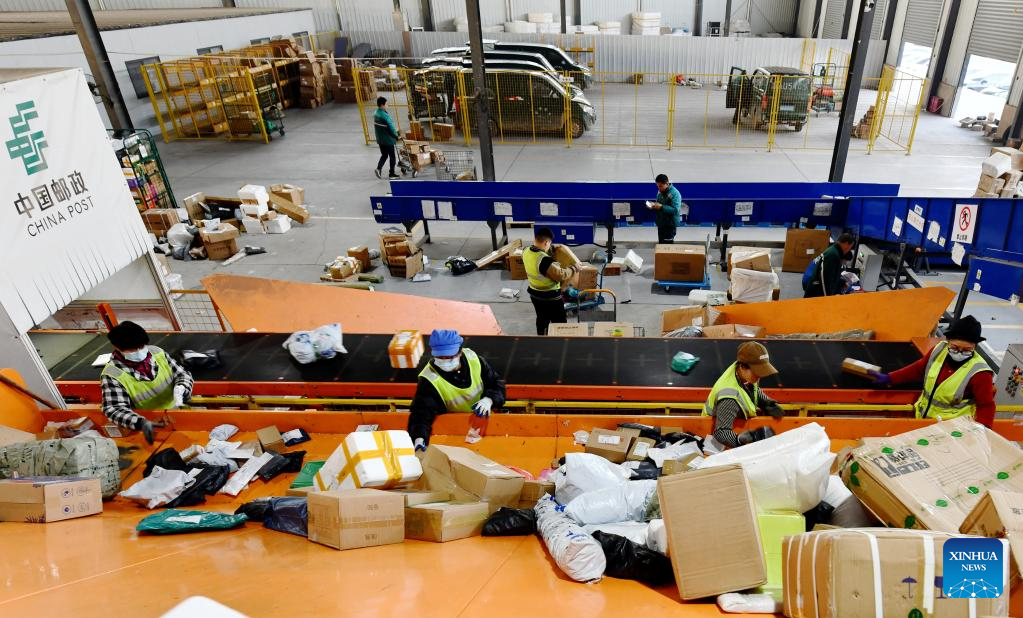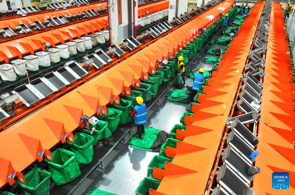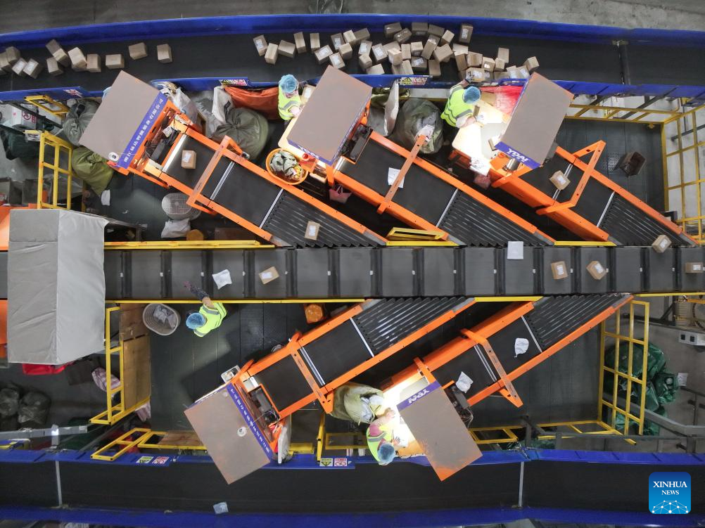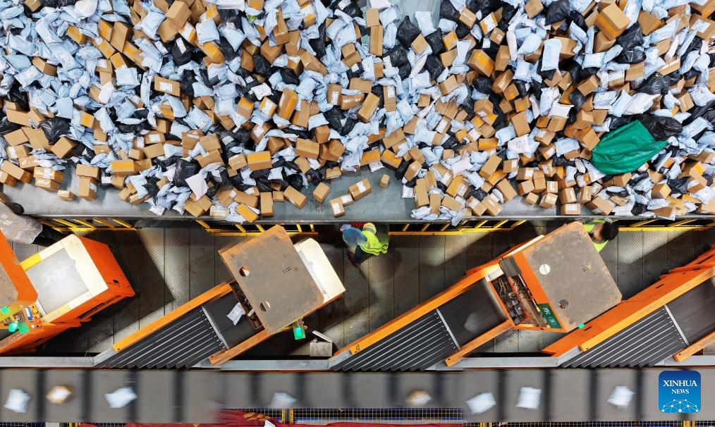 Staff members sort parcels at a branch of China Post in Shijiazhuang City, north China's Hebei Province, Nov. 11, 2025. E-commerce and logistics companies across China are working at full capacity during the annual "Double Eleven" shopping festival. (Photo by Li Mingfa/Xinhua)