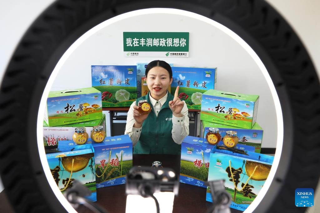 A staff member promotes local agricultural products via live-streaming at a branch of China Post in Tangshan City, north China's Hebei Province, Nov. 11, 2025. E-commerce and logistics companies across China are working at full capacity during the annual "Double Eleven" shopping festival. (Photo by Zhu Dayong/Xinhua)
