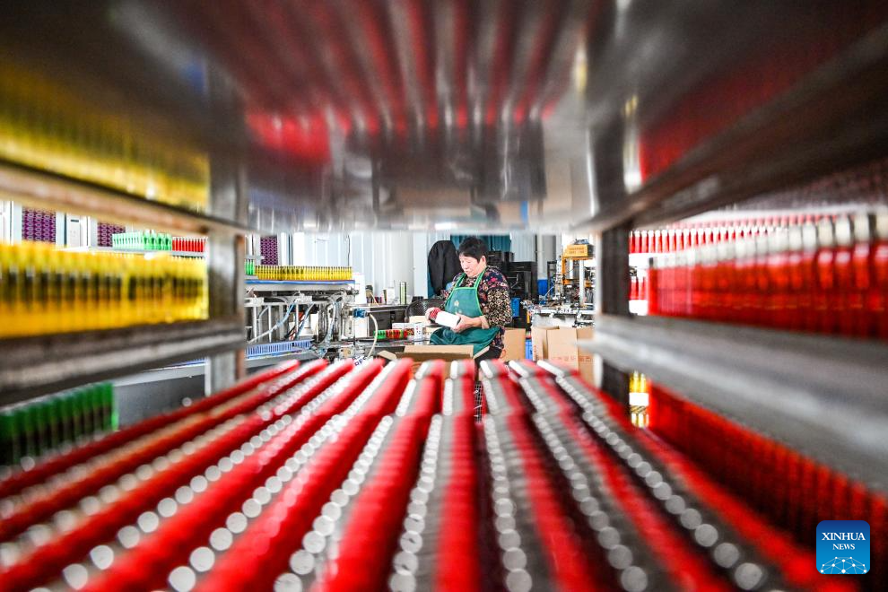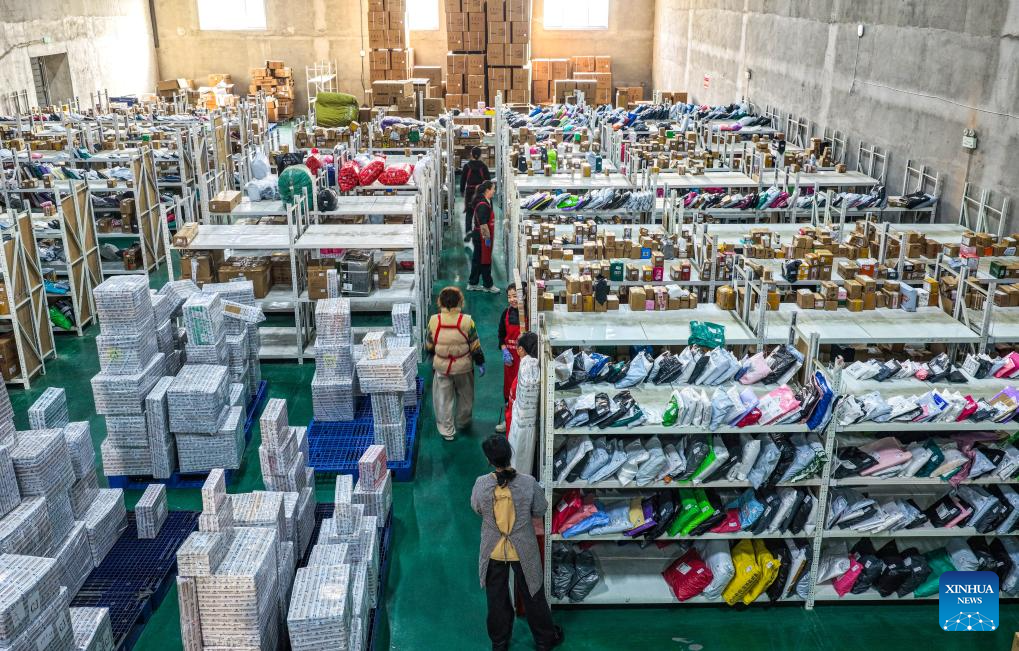 A worker packs products at an e-commerce company in Xiayi County of Shangqiu City, central China's Henan Province, Nov. 11, 2025. E-commerce and logistics companies across China are working at full capacity during the annual "Double Eleven" shopping festival. (Photo by Wang Gaochao/Xinhua)
