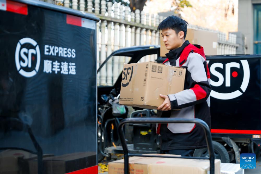 A deliveryman carries a package at a branch of courier service provider SF Express in Wuzhi County, central China's Henan Province, Nov. 11, 2025. E-commerce and logistics companies across China are working at full capacity during the annual "Double Eleven" shopping festival. (Photo by Wang Linfeng/Xinhua)