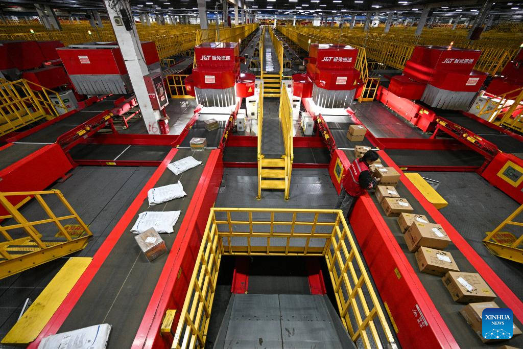 A staff member works at an automated parcel sorting line at an express hub of courier service provider J&T Express in Jiangning District of Nanjing City, east China's Jiangsu Province, Nov. 11, 2025. E-commerce and logistics companies across China are working at full capacity during the annual "Double Eleven" shopping festival. (Photo by Fang Dongxu/Xinhua)