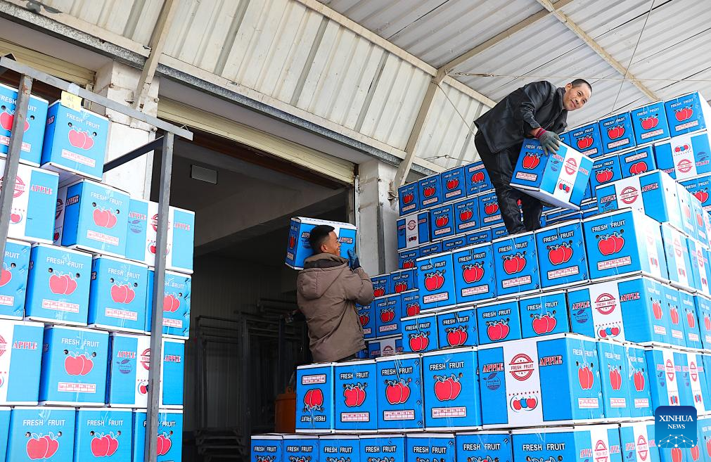 Staff members load boxed apples for sale at an industrial park in Jingning County of Pingliang City, northwest China's Gansu Province, Nov. 11, 2025. E-commerce and logistics companies across China are working at full capacity during the annual "Double Eleven" shopping festival. (Photo by Wang Yi/Xinhua)