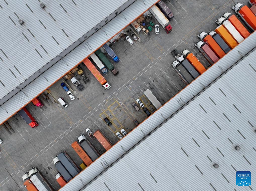This aerial drone photo taken on Nov. 11, 2025 shows trucks unloading goods at a logistics park in Longli County, southwest China's Guizhou Province. E-commerce and logistics companies across China are working at full capacity during the annual "Double Eleven" shopping festival. (Photo by Yuan Fuhong/Xinhua)