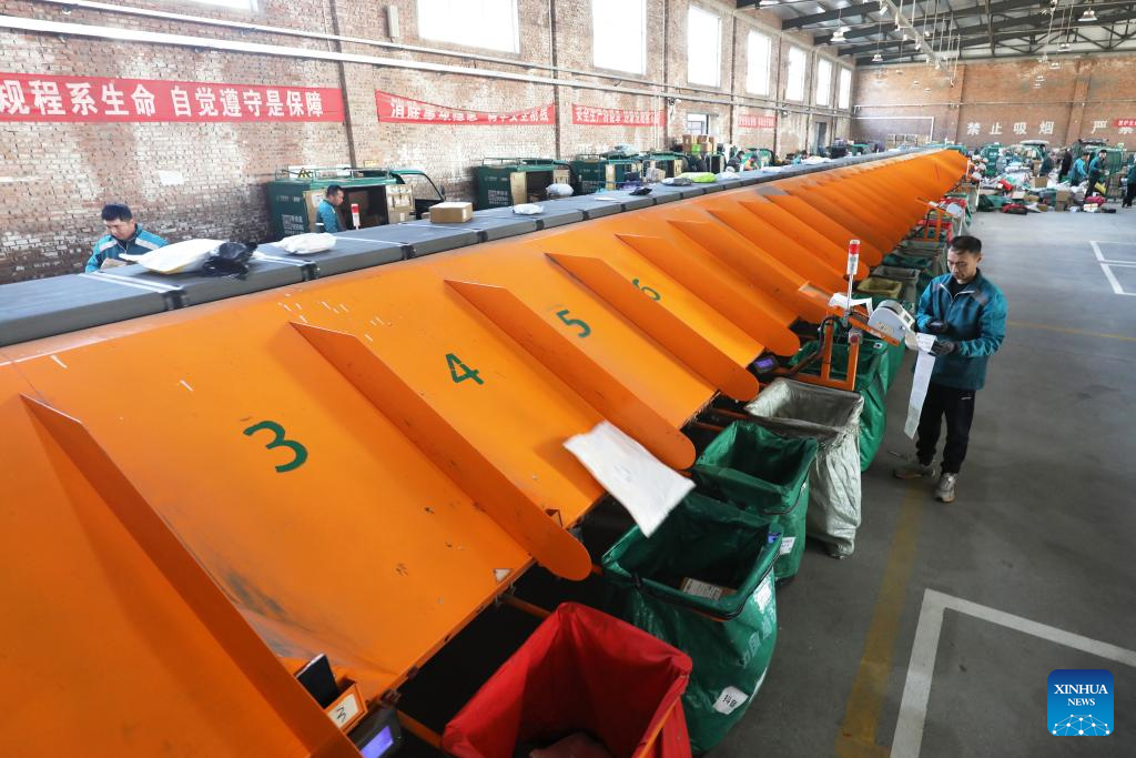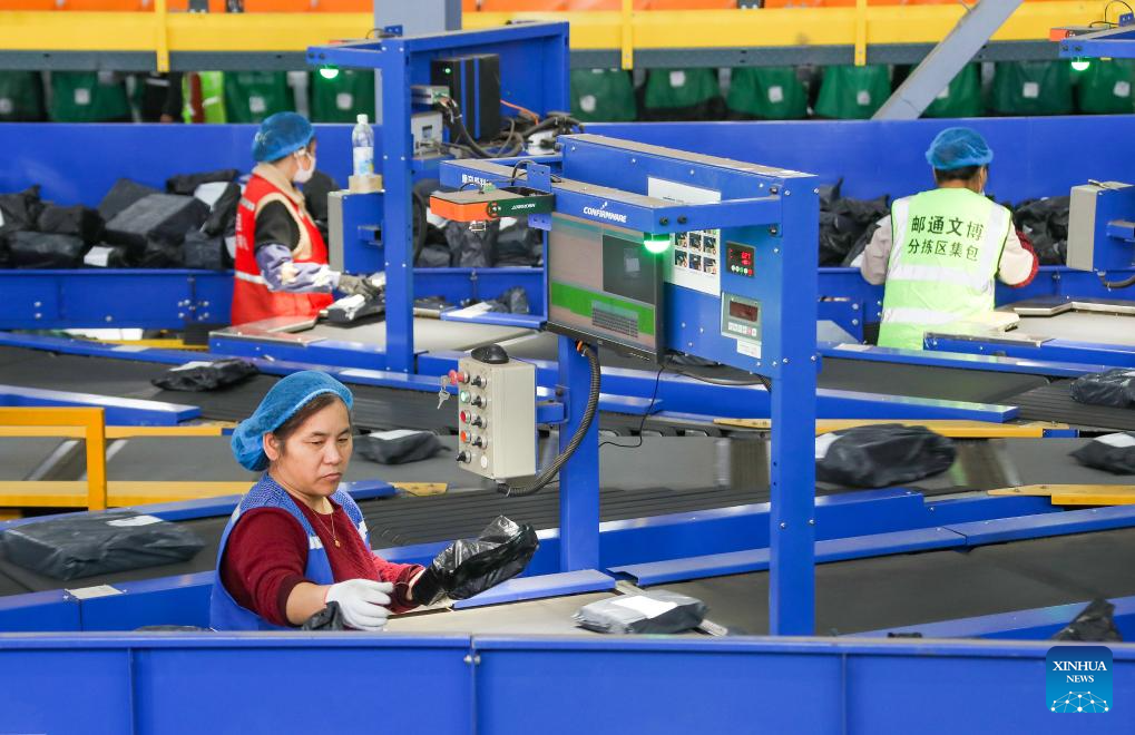 Staff members work at a branch of China Post in Tangshan City, north China's Hebei Province, Nov. 11, 2025. E-commerce and logistics companies across China are working at full capacity during the annual "Double Eleven" shopping festival. (Photo by Zhu Dayong/Xinhua)
