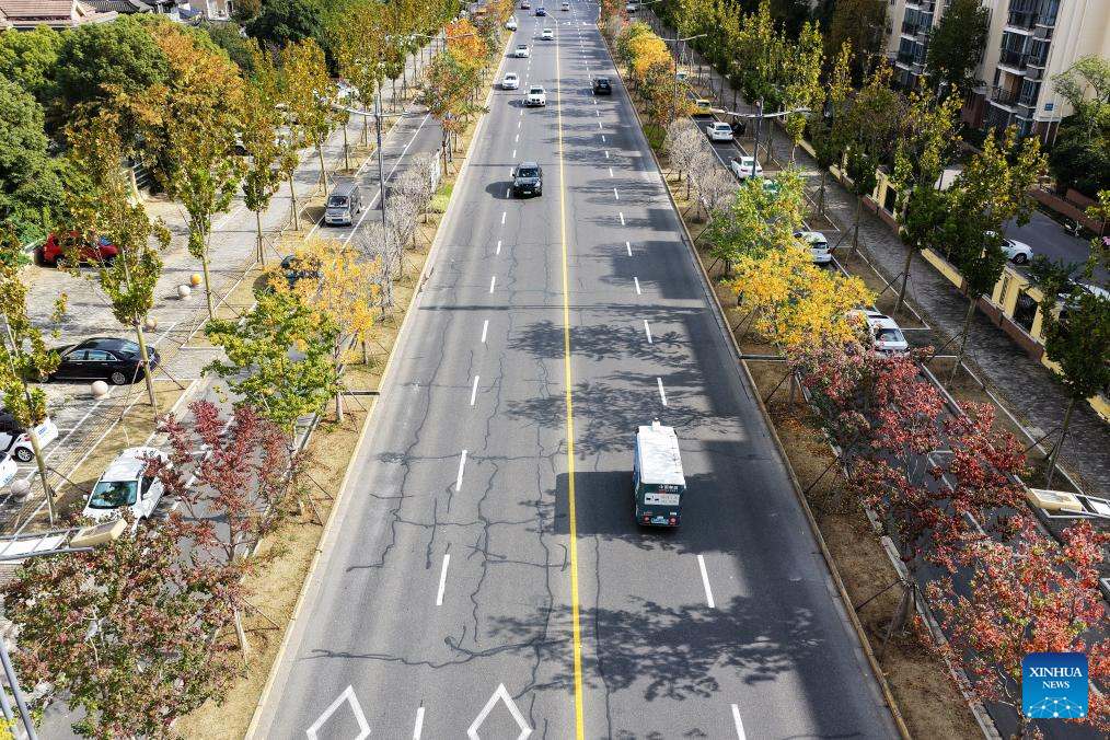 This aerial drone photo taken on Nov. 11, 2025 shows a self-driving delivery vehicle transporting packages in Yangzhou City, east China's Jiangsu Province. E-commerce and logistics companies across China are working at full capacity during the annual "Double Eleven" shopping festival. (Photo by Meng Delong/Xinhua)