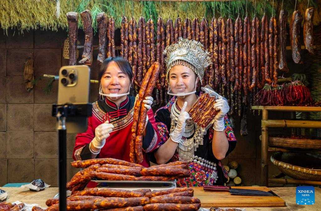 Staff members promote agricultural products via live-streaming in Qianxi City, southwest China's Guizhou Province, Nov. 11, 2025. E-commerce and logistics companies across China are working at full capacity during the annual "Double Eleven" shopping festival. (Photo by Fan Hui/Xinhua)