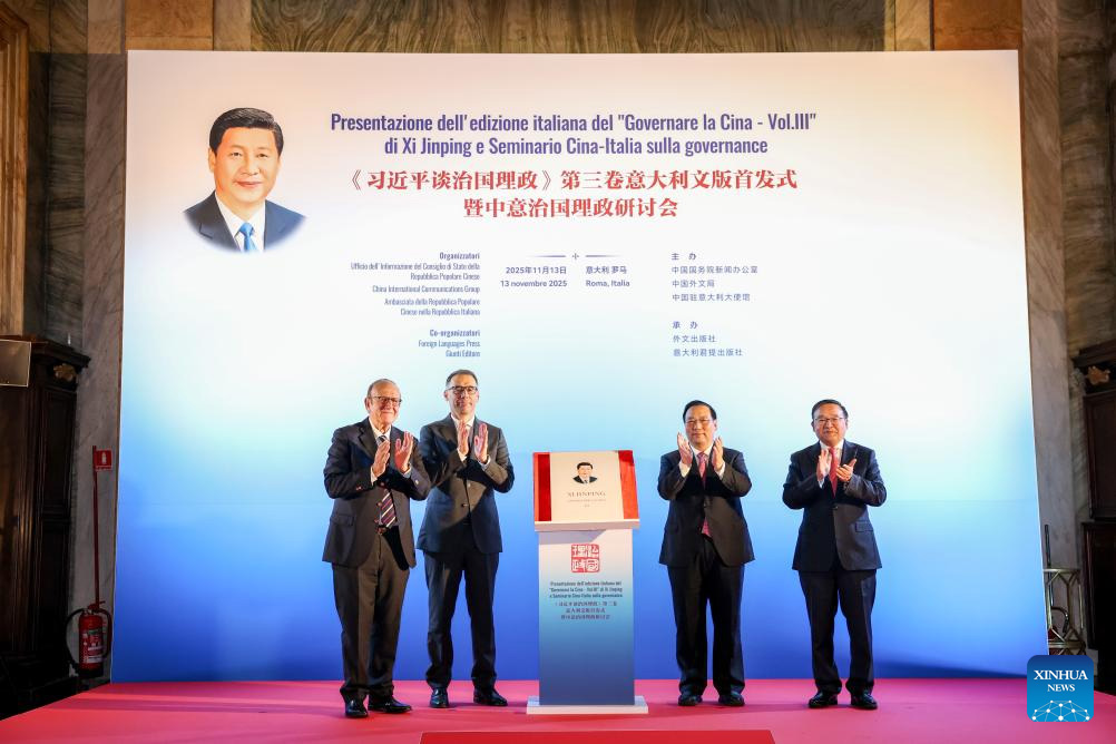 Guests unveil the Italian edition of the third volume of "Xi Jinping: The Governance of China" during the launch ceremony in Rome, Italy, Nov. 13, 2025. The launch event for the Italian edition of the third volume of "Xi Jinping: The Governance of China" and the China-Italy Symposium on State Governance were held here on Thursday, with about 150 representatives from various sectors of both countries in attendance. (Xinhua/Li Jing)