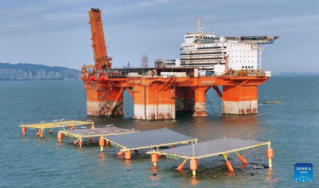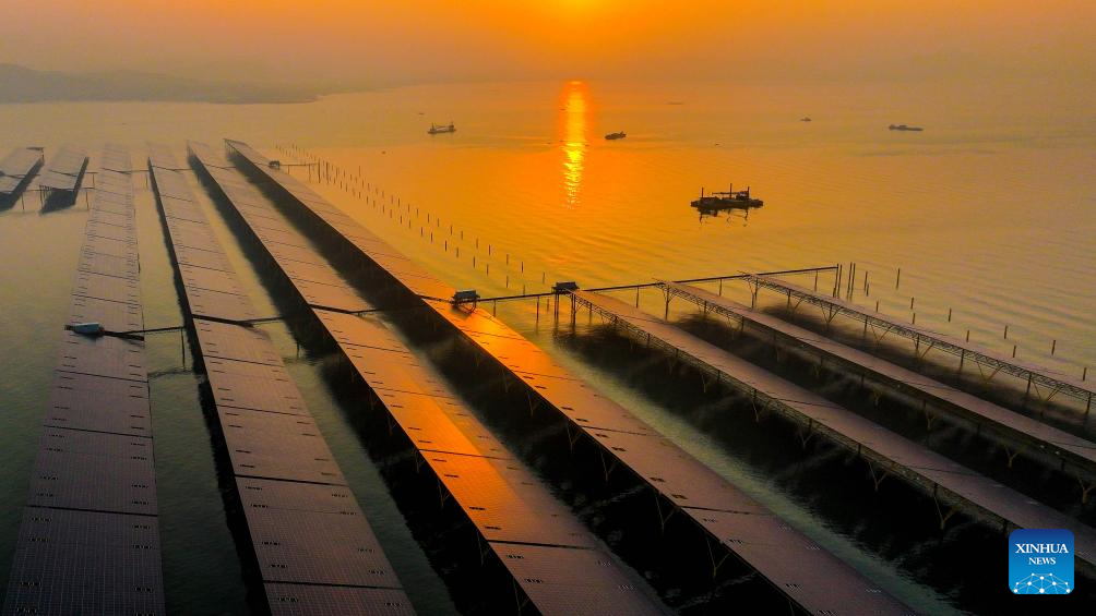 An aerial drone photo taken on Nov. 19, 2025 shows a floating photovoltaic platform and an offshore photovoltaic demonstration base in the waters of Yantai Hi-tech Industrial Development Zone in Yantai City, east China's Shandong Province. In 2020, China announced that it would strive to reach peak carbon dioxide emissions before 2030 and carbon neutrality before 2060. (Photo by Tang Ke/Xinhua)