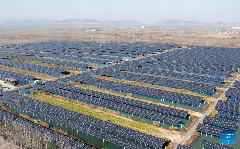 An aerial drone photo taken on Nov. 18, 2025 shows a "fishery and photovoltaic complementary" photovoltaic power generation project in a subsidence area of coal mines in Binhu Township of Tengzhou City, east China's Shandong Province. In 2020, China announced that it would strive to reach peak carbon dioxide emissions before 2030 and carbon neutrality before 2060. (Photo by Song Haicun/Xinhua)