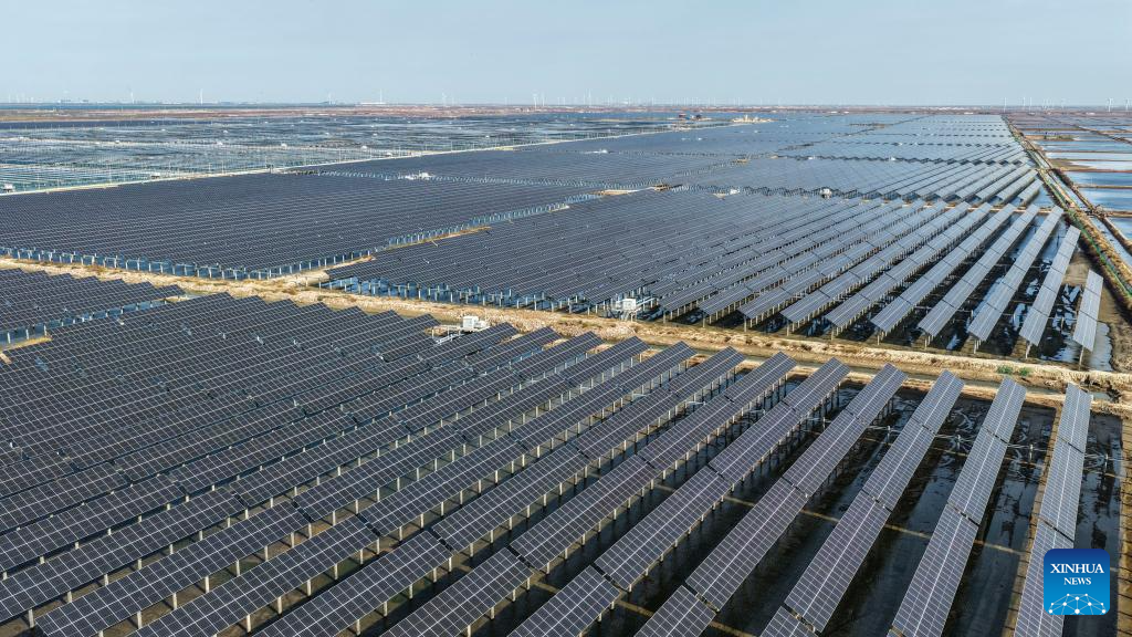 An aerial drone photo taken on Nov. 16, 2025 shows a 240-megawatt photovoltaic power generation project in Dongying City, east China's Shandong Province. In 2020, China announced that it would strive to reach peak carbon dioxide emissions before 2030 and carbon neutrality before 2060. (Photo by Liu Yunjie/Xinhua)