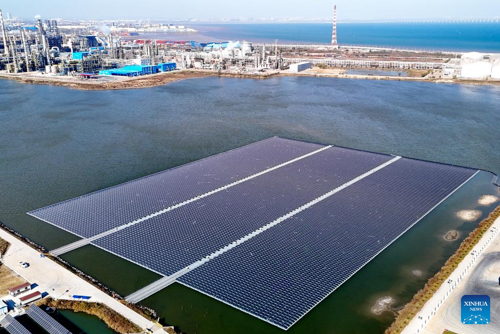 An aerial drone photo taken on Nov. 18, 2025 shows a floating photovoltaic project of Sinopec Qingdao Refining and Chemical Co., Ltd. in Qingdao, east China's Shandong Province. In 2020, China announced that it would strive to reach peak carbon dioxide emissions before 2030 and carbon neutrality before 2060. (Photo by Zhang Jingang/Xinhua)