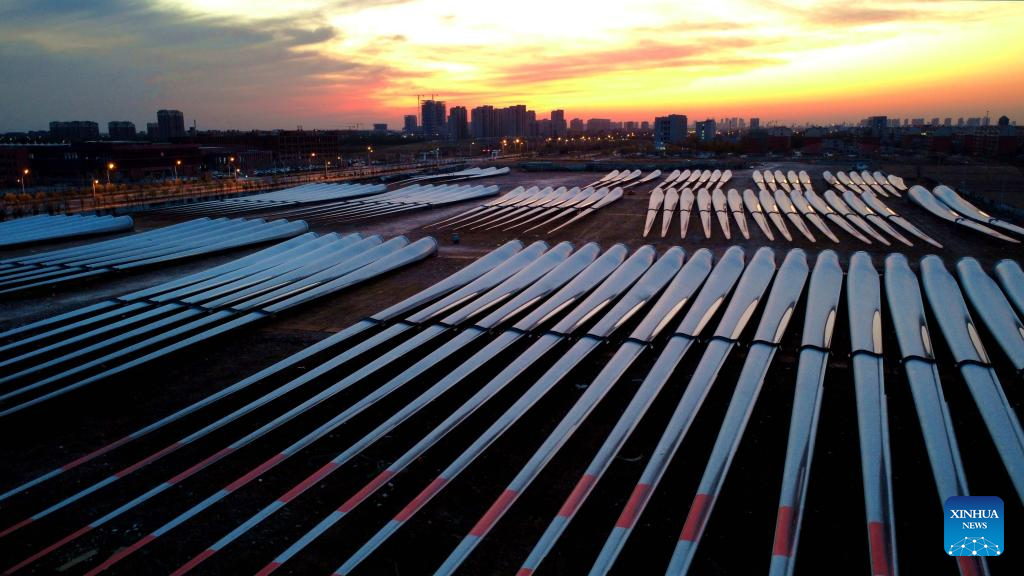 An aerial drone photo taken on Nov. 19, 2025 shows a blade storage yard of the wind power equipment manufacturing industrial park in Huimin County, east China's Shandong Province. In 2020, China announced that it would strive to reach peak carbon dioxide emissions before 2030 and carbon neutrality before 2060. (Xinhua/Guo Xulei)