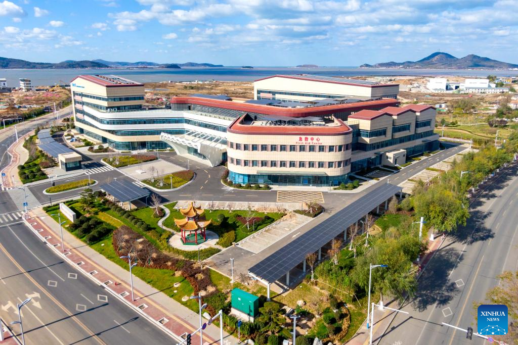 An aerial drone photo taken on Nov. 18, 2025 shows the rooftop zero-carbon photovoltaic installation of the People's Hospital of the Marine Ecological Civilization Comprehensive Experimental Area of Changdao in Yantai City, east China's Shandong Province. In 2020, China announced that it would strive to reach peak carbon dioxide emissions before 2030 and carbon neutrality before 2060. (Photo by Zhang Weikang/Xinhua)
