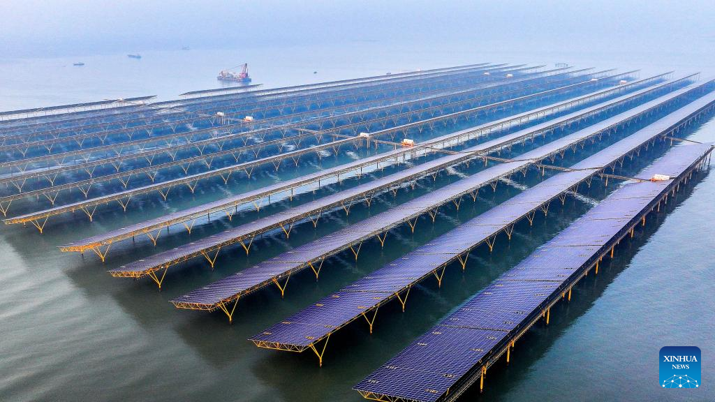 An aerial drone photo taken on Nov. 16, 2025 shows an offshore photovoltaic power generation project in the waters of Aoshanwan in Jimo District, Qingdao City, east China's Shandong Province. In 2020, China announced that it would strive to reach peak carbon dioxide emissions before 2030 and carbon neutrality before 2060. (Photo by Liang Xiaopeng/Xinhua)